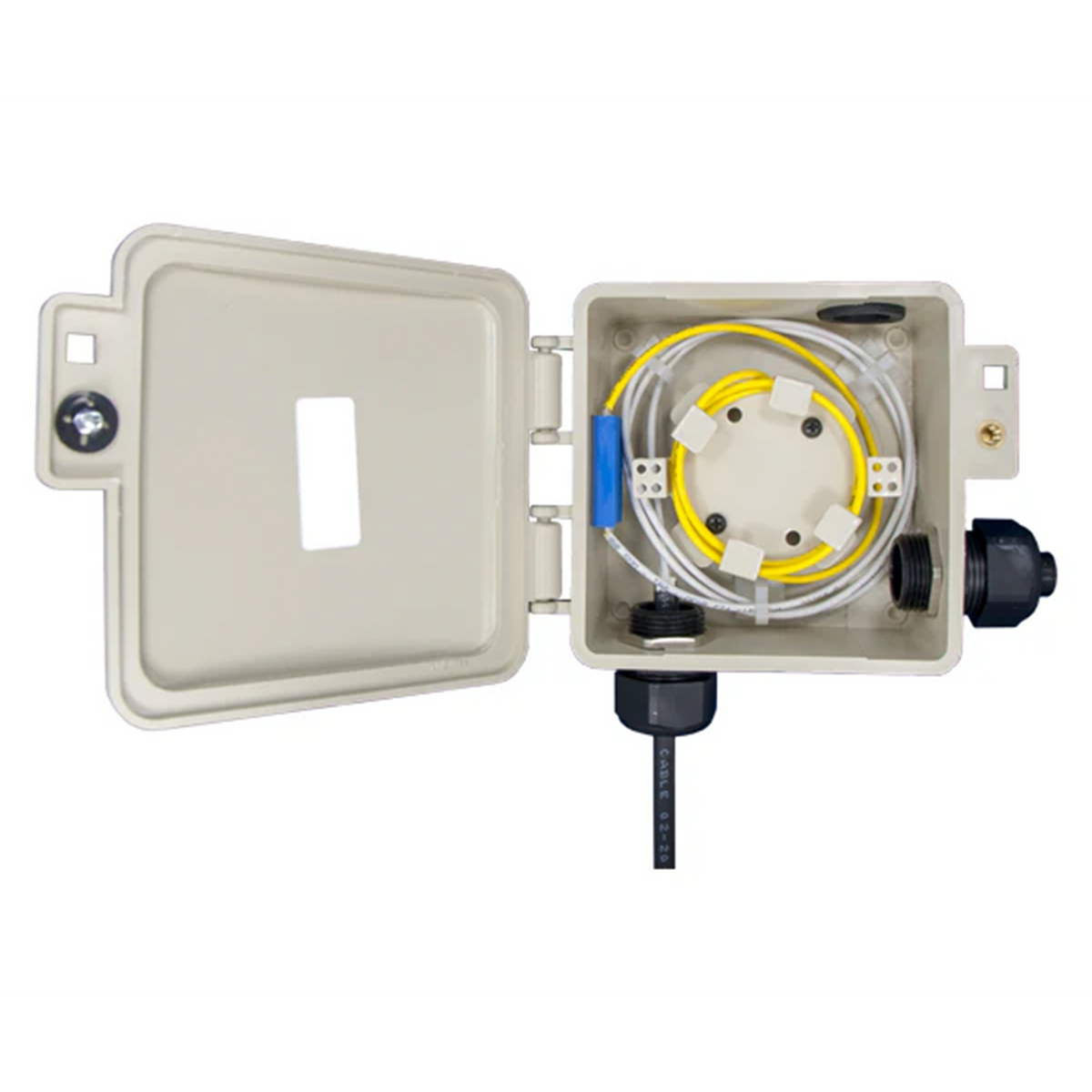 Ready-to-install exterior-rated slack storage box engineered for outdoor fiber management of 3mm single-fiber cables in outside plant (OSP) applications. This pre-configured enclosure features three factory-drilled 1" cable entry points with removable cap plugs, eliminating field drilling while providing flexible cable routing options. Dual removable stackable spools provide versatile fiber storage configurations for drop cable installations. Ideal for aerial, pole-mounted, and exterior wall installations requiring immediate deployment without field modifications.