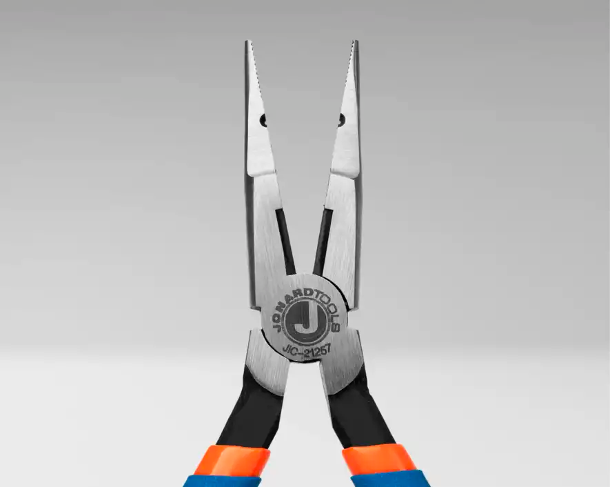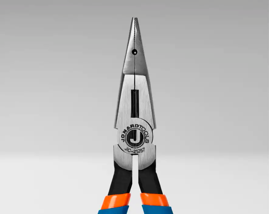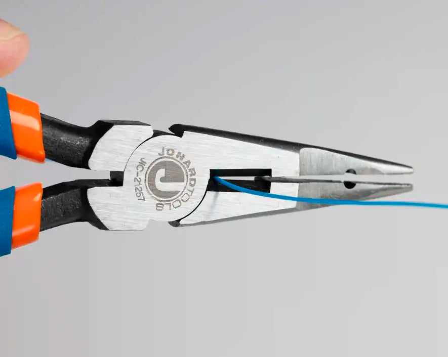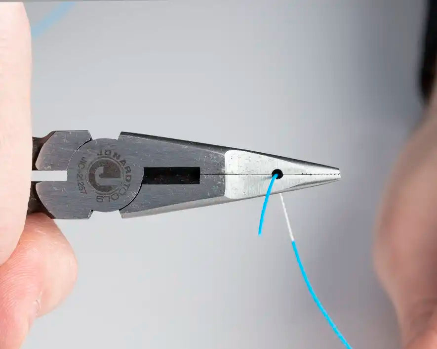 Jonard’s Telecom Long Nose Pliers are built for precision work in tight telecom and network environments. Constructed from heat-treated chrome vanadium steel with induction-hardened cutting edges, they deliver lasting strength and sharpness. The side-cut blades trim conductors cleanly, while a 0.030″ stripping hole readies 22 AWG wire in one swift motion. A slim, knurled nose ensures secure gripping and routing of fine wires at central office terminals. Ergonomic dipped-plastic handles provide superior comfort and leverage during extended use.